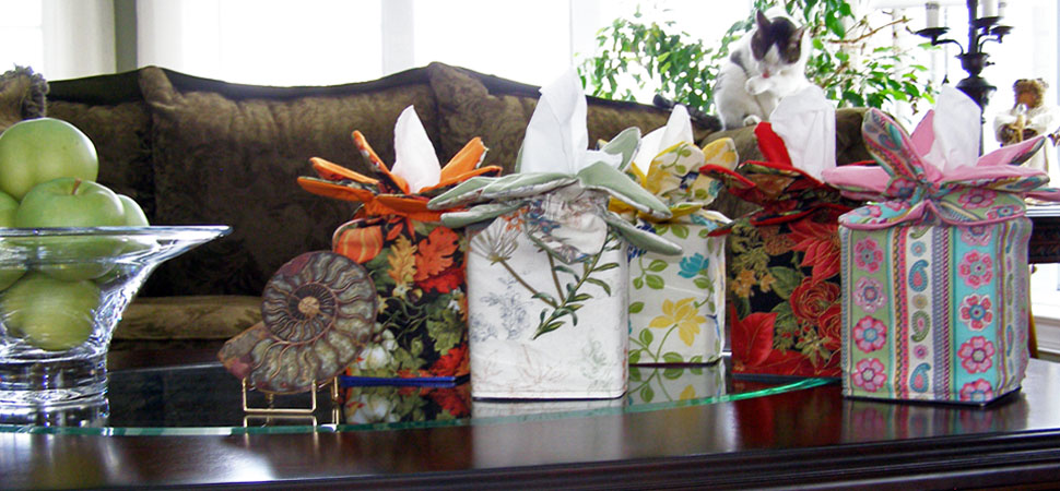 Turn plain tissue boxes into a decorative table accent. Hand made cloth covers come in a variety of styles to suit the room and season.